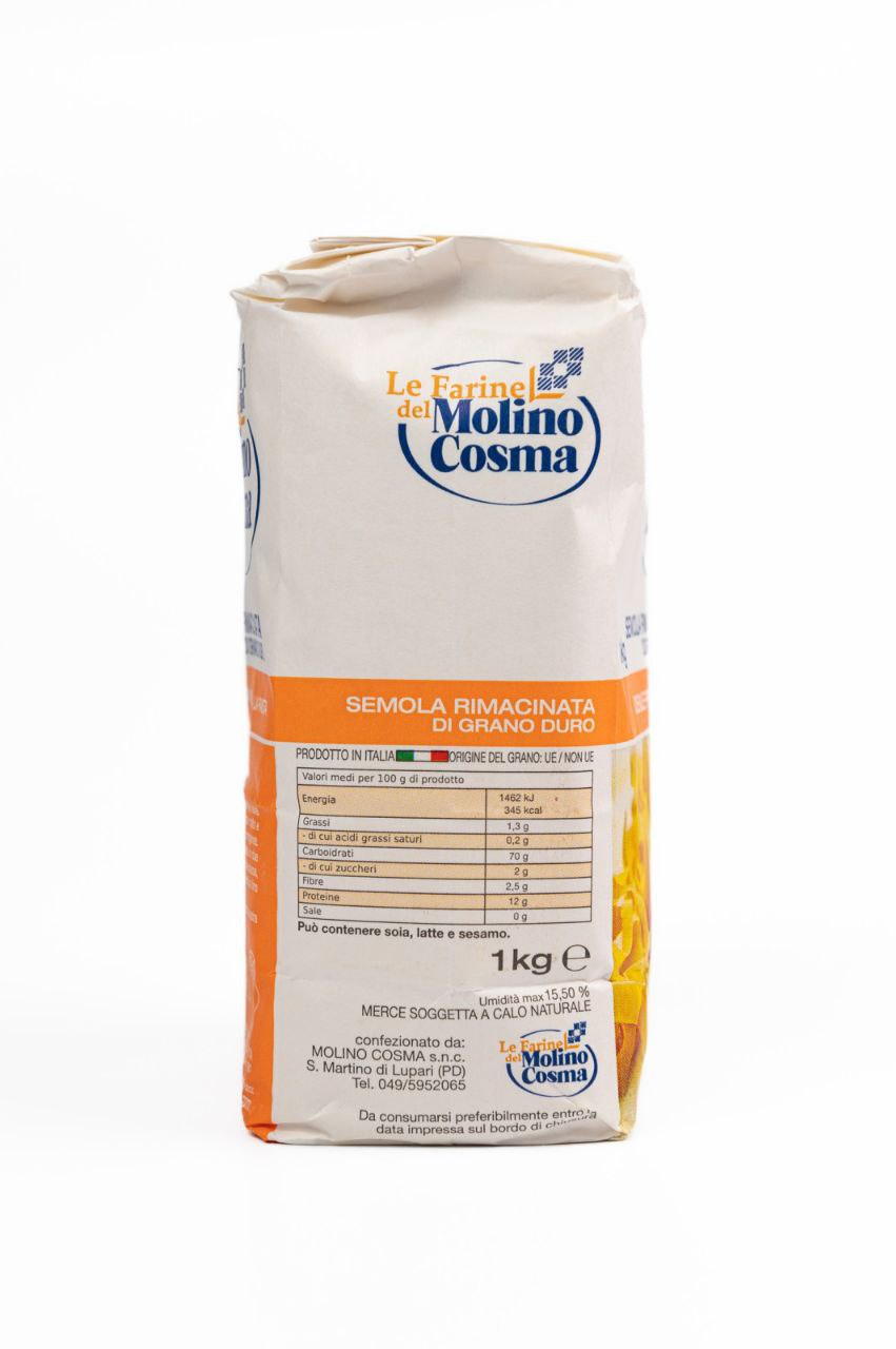 Molino Cosma Semola Rimacinata – це борошно з твердих сортів пшениці, яке відрізняється дрібним помелом, високим вмістом білка та жовтуватим кольором. Завдяки особливому процесу відбору та обробки зерна, з нього виходить ідеальна свіжа паста, ароматний хліб та традиційна випічка.