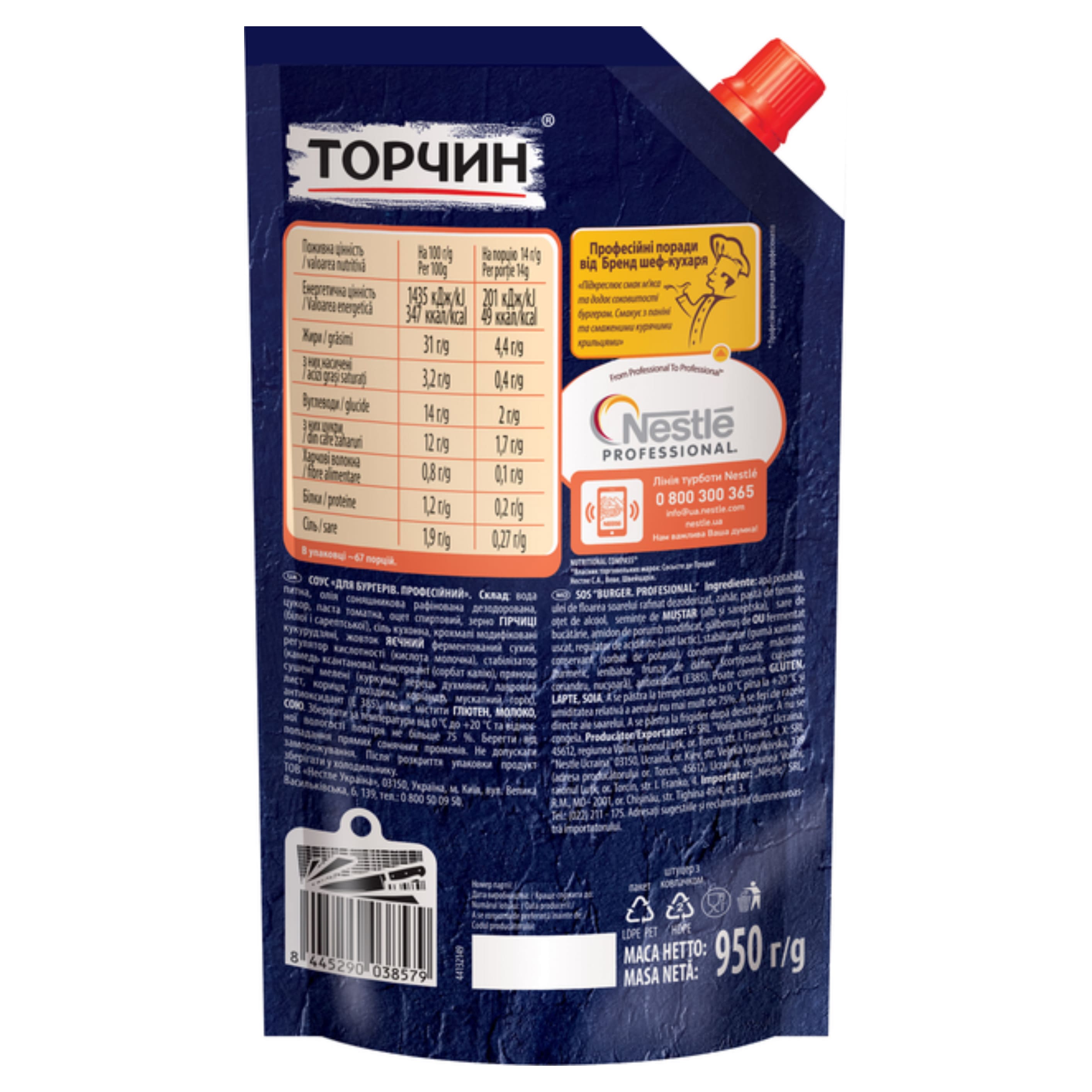 Склад: Вода питна, олія соняшникова рафінована дезодорована, цукор, паста томатна, зерно гірчиці (білої і сарептської), оцет спиртовий, сіль кухонна, крохмалі модифіковані кукурудзяні, жовток яєчний ферментований сухий, регулятори кислотності (кислота оцтова, кислота молочна), стабілізатор (камедь ксантанова), консервант (сорбат калію), спеції сушені мелені (куркума, перець духмяний, лавровий лист, кориця, гвоздика, коріанд, мускатний горіх), антиоксидант (Е385). Гірчиця, яєчні продукти. Може містити селеру, глютен, молоко, сою.