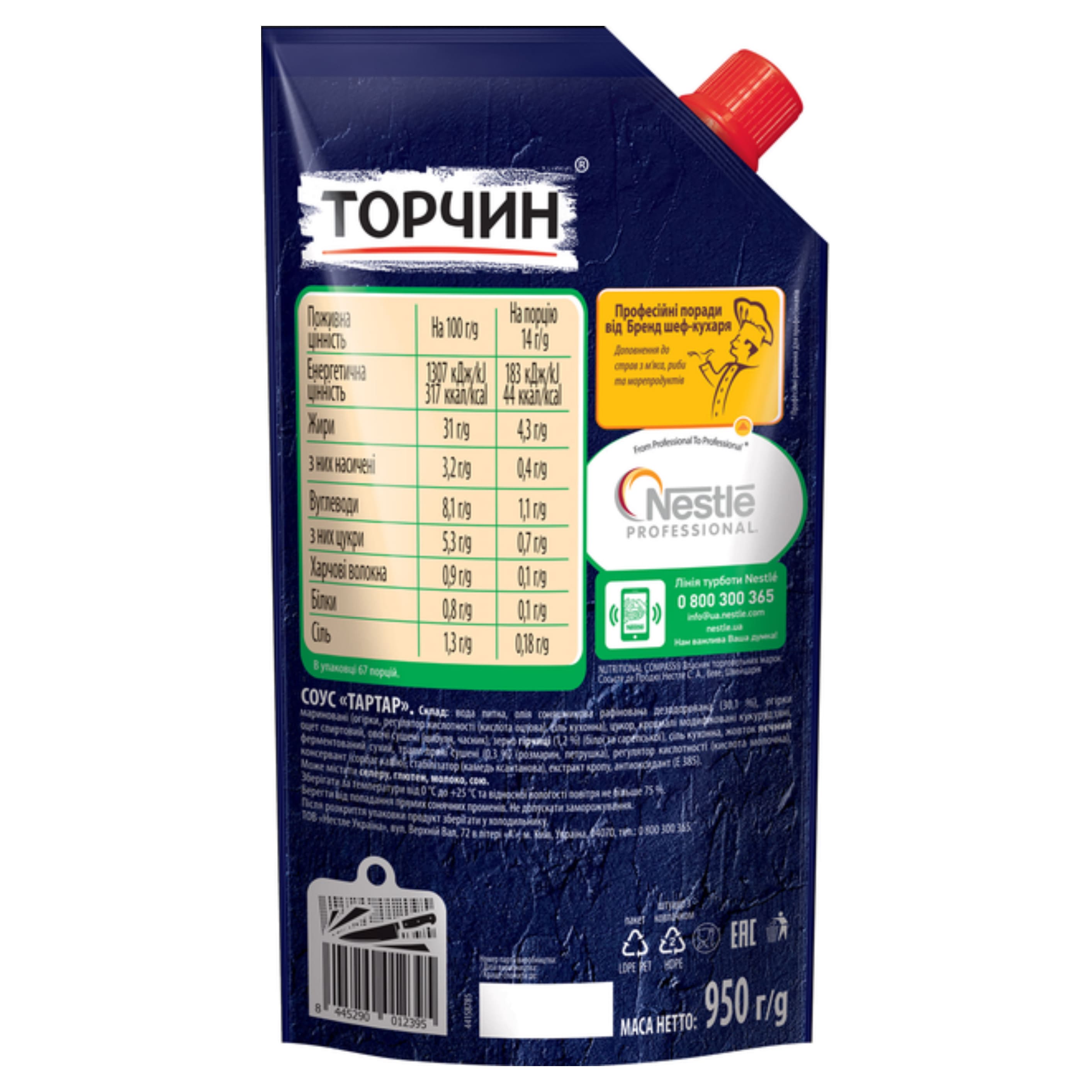 Соус Торчин Тартар у професійному форматі має ніжну консистенцію та яскравий аромат. Шматочки маринованих огірків надають йому кисло-солодкий смак, а цибуля, сушена зелень і спеції додають пряні нотки.